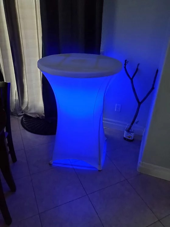 This Cocktail tables with lights will add elegance to your next event. The lights change to any color you like with just a touch of a bottom. These come with a fully charge battery and control remote that will last all night.
