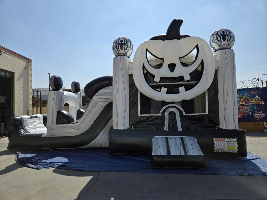 Make your Halloween event unforgettable with the Black and Silver Pumkin Jumper Slide. This eye-catching inflatable combines a dramatic black and silver colorway with pumpkin-themed accents. Ideal for seasonal parties, school events, and haunted attractions, this unit is designed to thrill guests of all ages. Book the Black and Silver Pumkin Jumper Slide as a top-tier Halloween Jumper slide for rent and deliver spine-tingling fun. 👻