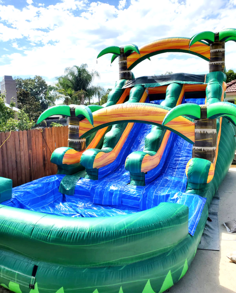 The tropical dual lane is a fun water slide for larger groups, perfect for ages 10 and older. A 16x32 space is required for setup. Green grass and level area is suggested for this unit.